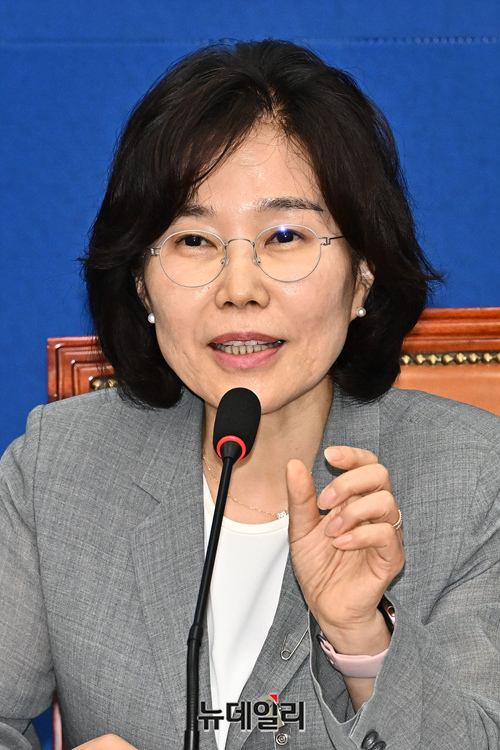 김은경 더불어민주당 혁신위원장이 12일 오후 국회에서 열린 기자간담회에서 취재진의 질문에 답하고 있다.