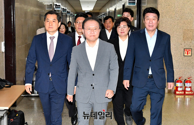 윤재옥 국민의힘 원내대표와 지도부가 13일 오전 국회에서 열린 최고위원회의에 참석하기 위해 입장 하고 있다.
