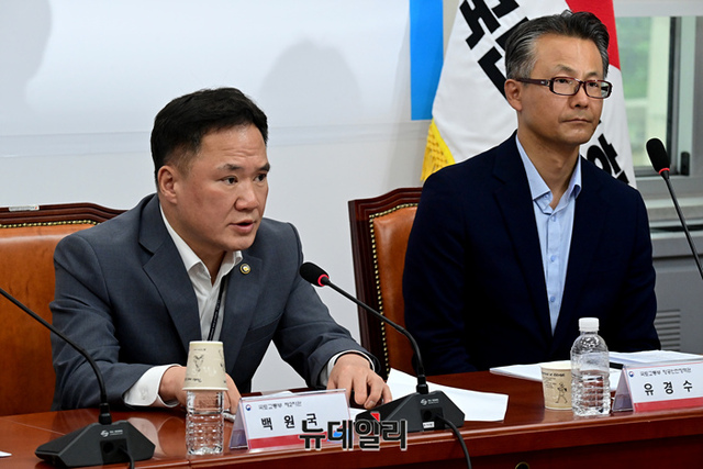 백원국 국토교통부 차관이 13일 오전 국회에서 열린 항공기 비상문 안전 강화대책 당·정 협의에서 발언하고 있다.