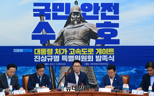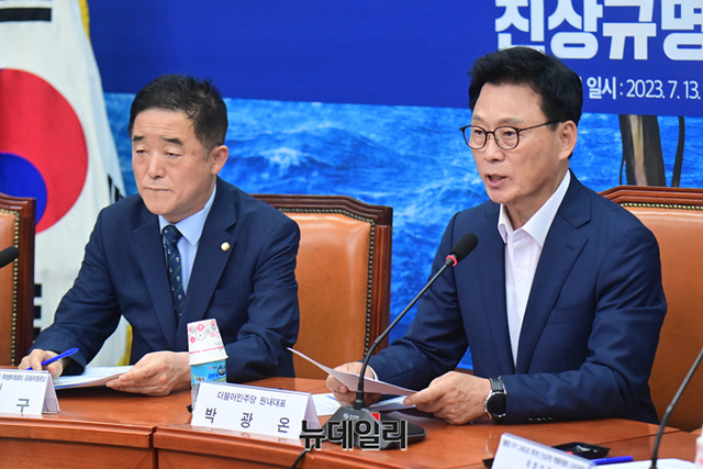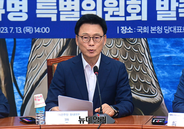 박광온 더불어민주당 원내대표가 13일 국회에서 열린 대통령 처가 고속도로 게이트 진상규명 특별위원회 첫 회의에서 발언을 하고 있다.