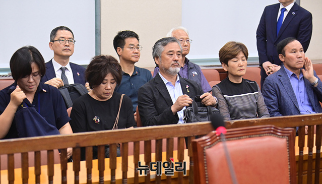 이태원 참사 유가족들 13일 오후 국회에서 열린 행정안전위원회 전체회의 '10·29이태원참사 피해자 권리보장과 진상규명 및 재발방지를 위한 특별법안에 관한 입법 공청회'에 참석해 앉아 있다.