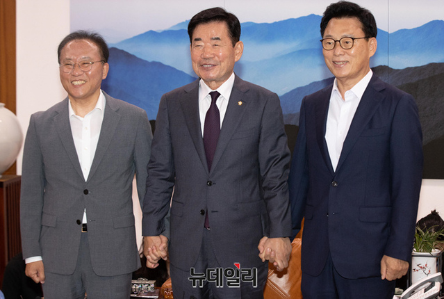 김진표 국회의장과 윤재옥 국민의힘 원내대표, 박광온 더불어민주당 원내대표가 13일 국회에서 열린 국회의장 주재 양당 원내대표 회동에서 기념촬영을 하고 있다.