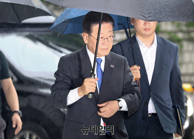 공직선거법위반 혐의를 받고 있는 이재명 더불어민주당 대표가 14일 오전 서울 서초구 중앙지법에서 열린 9차 공판에 우산을 쓰고 출석하고 있다.