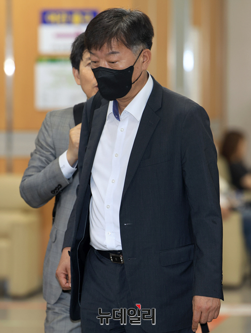 김홍희 전 해양경찰청장이 14일 오전 서울 서초구 중앙지방법원에서 열린 서해피격 사건 공판에 출석하고 있다.