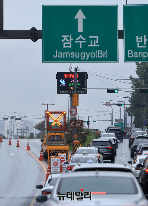 장마가 이어지고 있는 14일 오전 서울 반포대교 남단에서 잠수교의 출입을 통제하고 있다. 잠수교를 비롯해 서울 주요도로 곳곳이 통제되고 있다.