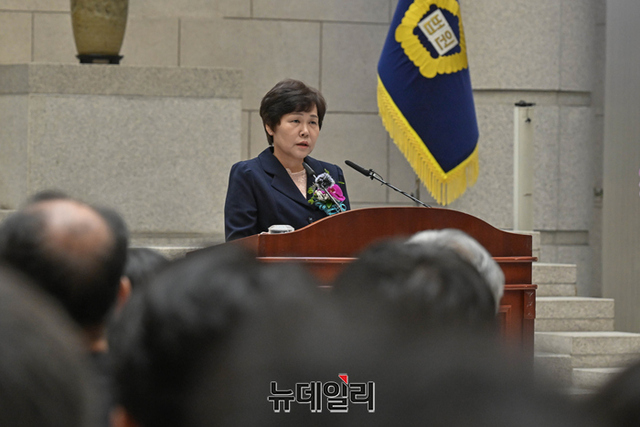 박정화 대법관이 18일 오전 서울 서초구 대법원에서 열린 퇴임식에서 퇴임사를 하고 있다. (사진=공동취재단)