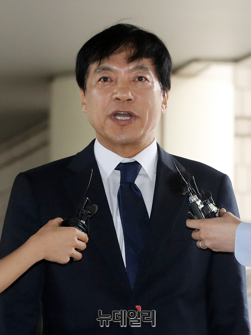 '김학의 전 법무부 차관의 불법 출국금지' 의혹 수사를 방해한 혐의로 기소돼 1심에서 무죄를 선고받은 이성윤 법무연수원 연구위원(전 서울고검장)이 18일 오후 서울 서초구 서울고등법원에서 열린 항소심 첫 재판에 출석하며 취재진의 질문에 답하고 있다.