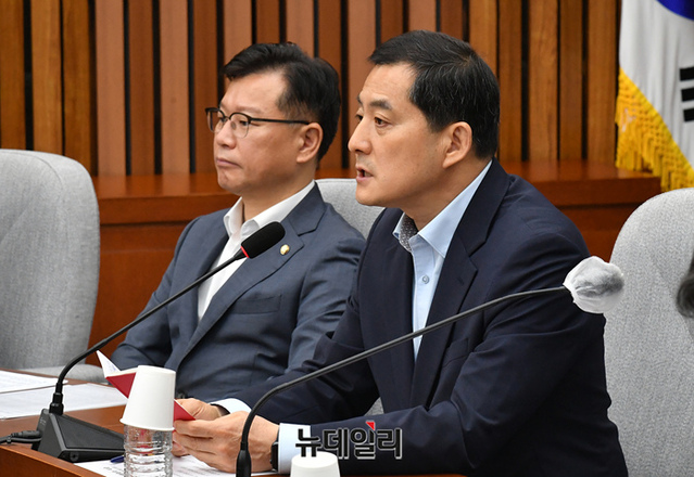 박대출 국민의힘 정책위의장이 9일 오전 국회에서 열린 원내대책회의에 참석해 모두발언을 하고 있다.