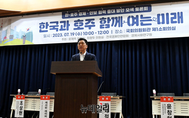 김기현 국민의힘 대표가 19일 국회 의원회관에서 윤재옥·최형두 의원실 주최로 열린 한·호주 경제·안보 협력 증대 방안 모색 토론회에서 축사를 하고 있다.