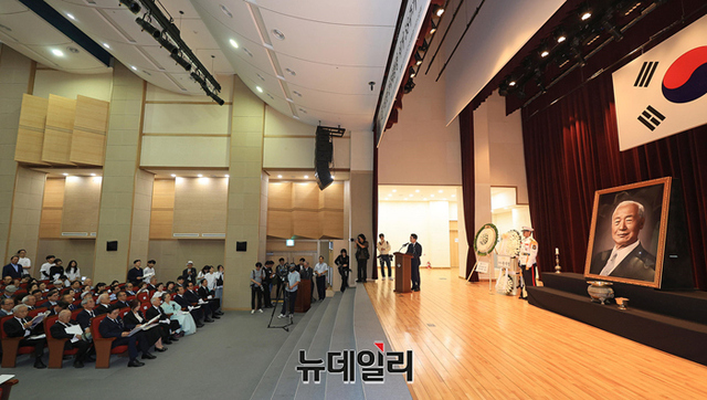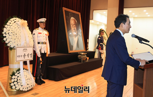 박민식 국가보훈부 장관이 19일 오전 서울 동작구 국립서울현충원 현충관에서 열린 이승만 건국대통령 서거 58주기 추모식에서 추모사를 하고 있다.
