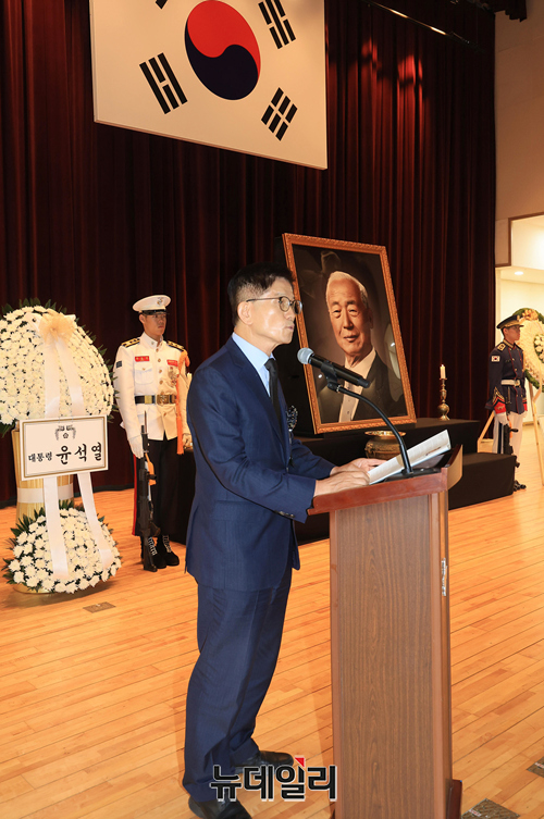 김문수 경제사회노동위원장이 19일 오전 서울 동작구 국립서울현충원 현충관에서 열린 이승만 건국대통령 서거 58주기 추모식에서 추모사를 하고 있다.