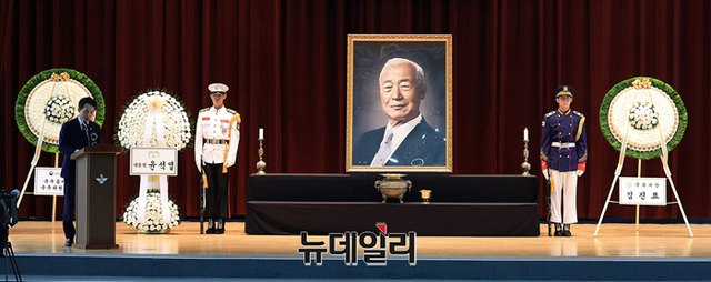 [포토] 이승만 건국대통령 서거 58주기 추모식에 첫 등장한 '국무총리-국회의장' 조화