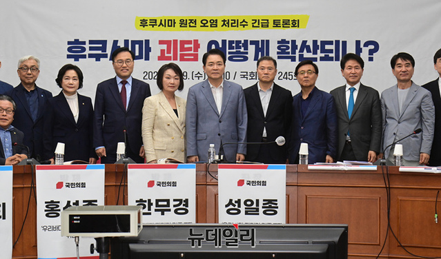 성일종 국민의힘 '우리바다 지키기 검증 태스크포스(TF)' 위원장 등 참석자들이 19일 국회에서 열린 후쿠시마 원전 오염 처리수 긴급 토론회 '후쿠시마 괴담 어떻게 확산되나?'에서 기념촬영을 하고 있다.