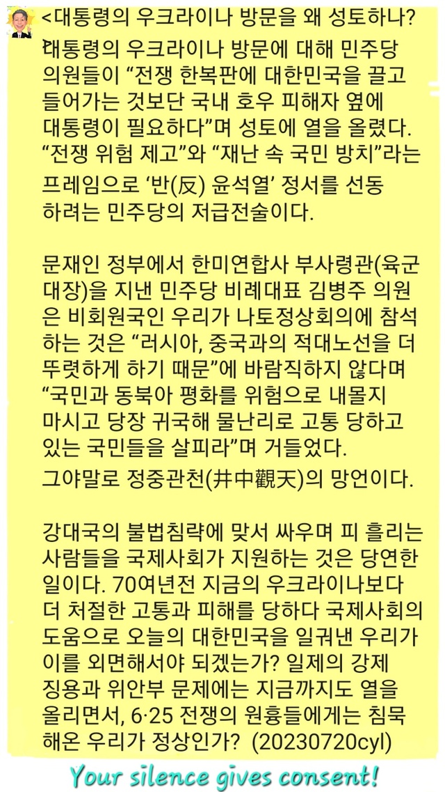 <대통령의 우크라이나 방문을 성토하는 사람들>대통령의 우크라이나 방문에 대해 민주당 의원들이 “전쟁 한복판에 대한민국을 끌고 들어가는 것보단 국내 호우 피해자 옆에 대통령이 필요하다”며 성토에 열을 올렸다.