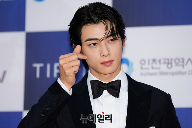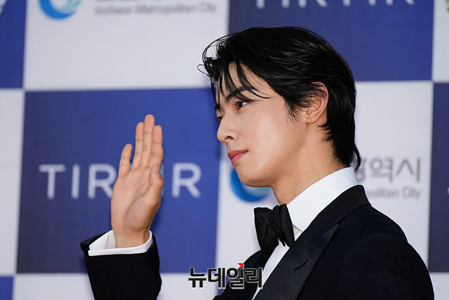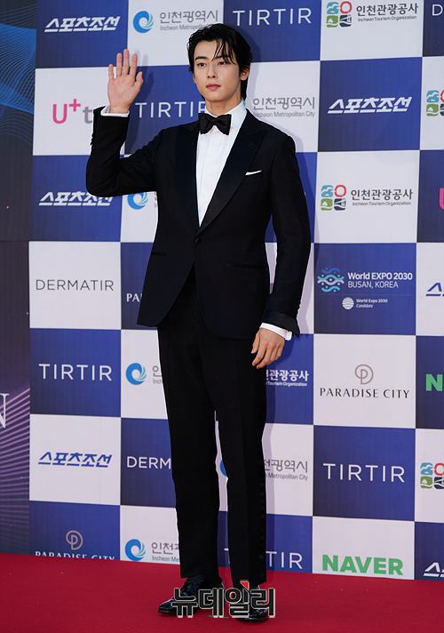 아스트로 차은우가 19일 오후 인천 중구 파라다이스시티에서 열린 '제2회 청룡시리즈어워즈' 레드카펫 행사에서 포즈를 취하고 있다.