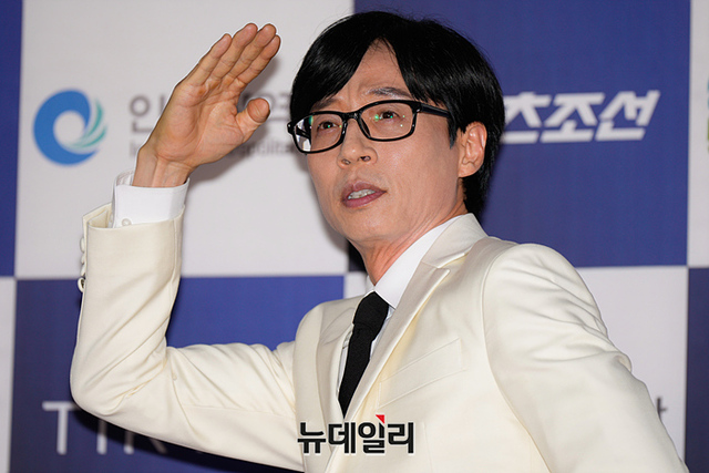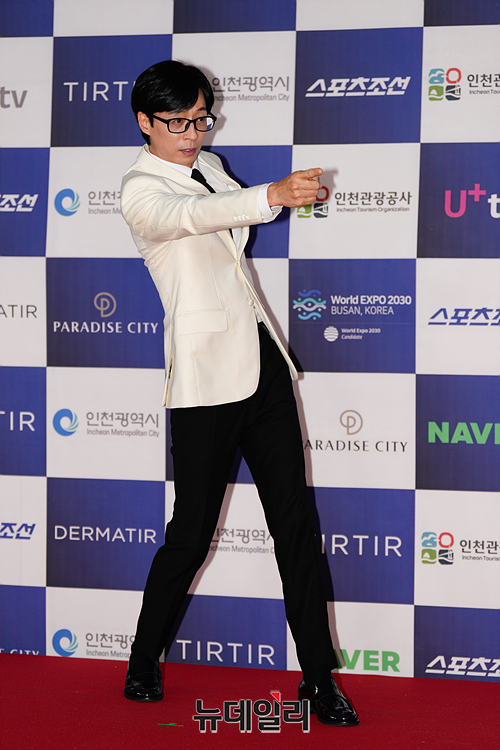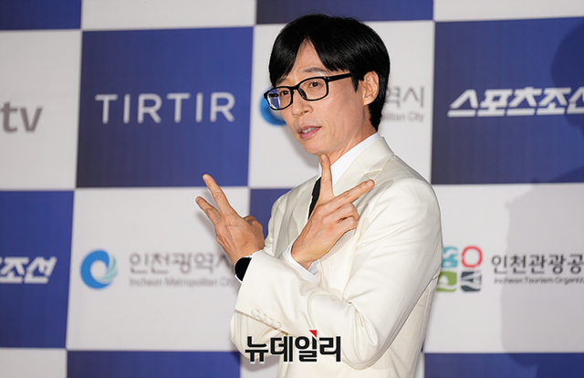 방송인 유재석이 19일 오후 인천 중구 파라다이스시티에서 열린 '제2회 청룡시리즈어워즈' 레드카펫 행사에서 포즈를 취하고 있다.