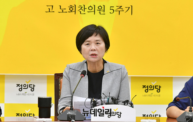 이정미 정의당 대표가 20일 오전 국회에서 열린 제71차 상무집행위원회 회의에서 발언을 하고 있다.