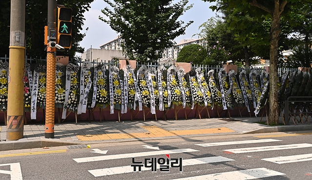 극단적 선택을 한 초등교사를 추모하는 근조화환이 20일 오전 서울 서초구 서이초등학교 앞에 늘어서 있다.