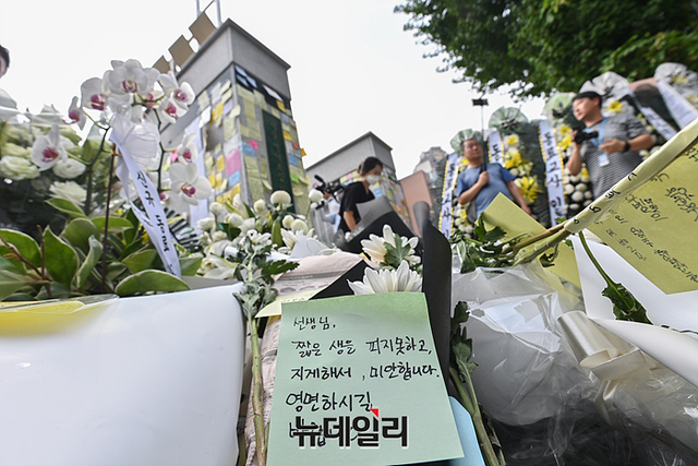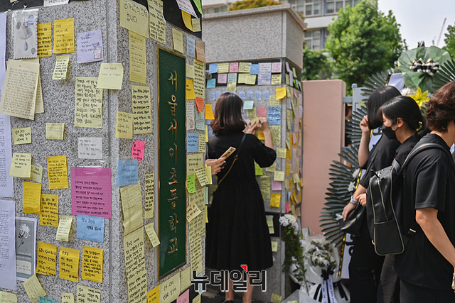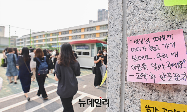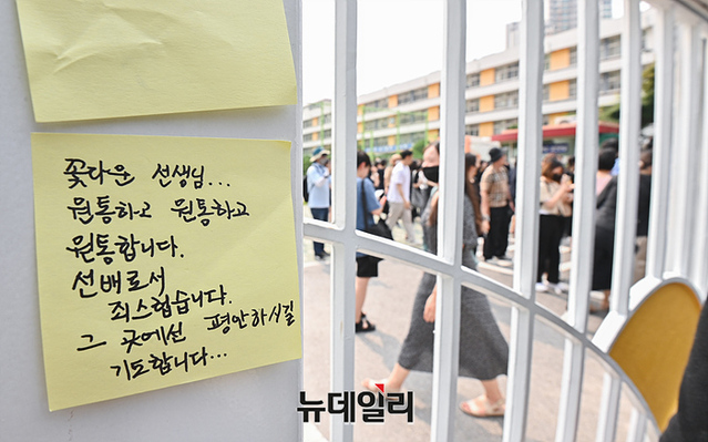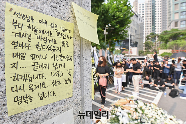 극단적 선택을 한 20대 여교사를 추모하는 글귀가 20일 오전 서울 서초구 서이초등학교 정문에 붙어있다.