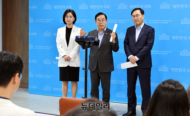 박성중 과학기술정보방송통신위원회 국민의힘 간사 및 의원들이 20일 오후 국회 소통관에서 '국회 과학기술정보방송통신위원회 정상화' 촉구 기자회견을 하고 있다.