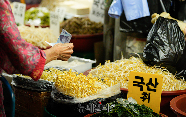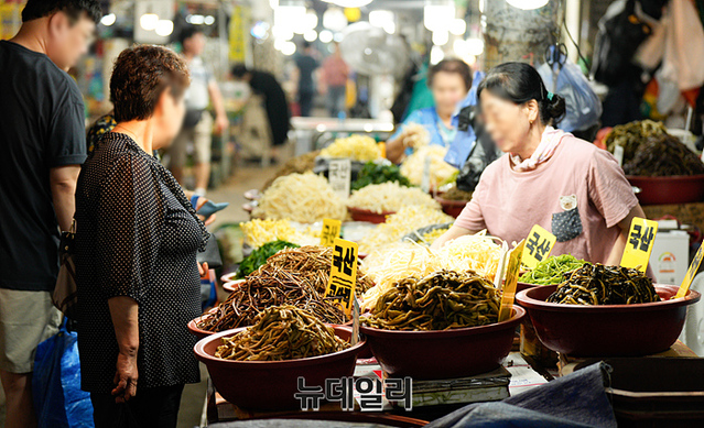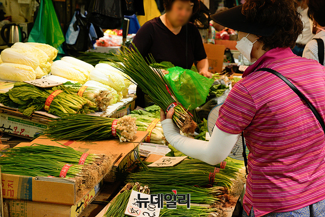 최근 이어진 집중호우로 인해 농가들이 피해를 입으면서 채소값이 연일 상승중인 21일 오전 서울 동대문구 경동시장을 찾은 시민들이 채소를 고르고 있다.