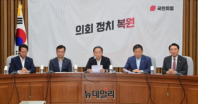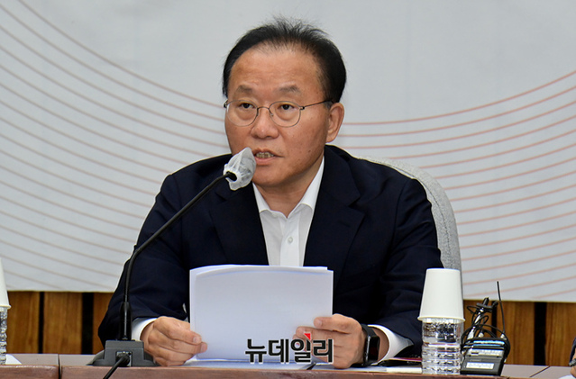 윤재옥 국민의힘 원내대표가 21일 오전 국회에서 열린 원내대책회의에 참석해 모두발언을 하고 있다.이날 윤 원내대표는 서초 초등교사 사망 사건을 언급하며 "각종 온라인 커뮤니티를 중심으로 이 교사가 학교폭력업무를 담당하며 학부모의 악성 민원에 시달렸고 학부모 가족이 3선 국회의원이라는 이야기가 퍼졌다. 이에 해당 학부모 찾기가 벌어진 가운데 20일 방송인 김어준 씨가 유튜브 방송에서 '국민의힘 소속 3선 의원으로 알고 있다. 대단한 파장이 있을 사안'이라고 주장했다"고 밝히고 가짜 뉴스를 퍼트린 김 씨를 고발하기로 했고 밝혔다.