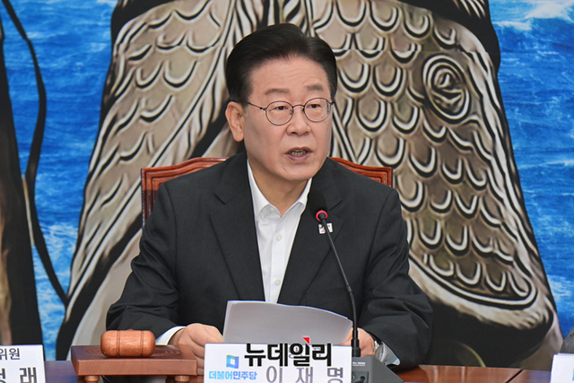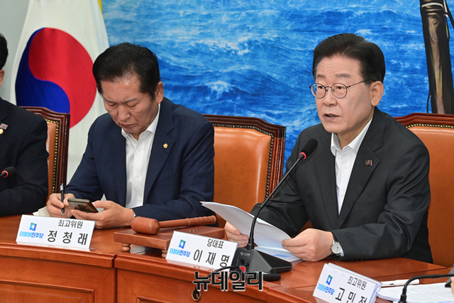 이재명 더불어민주당 대표가 21일 오전 국회에서 열린 최고위원회의에서 참석해 모두발언을 하고 있다.