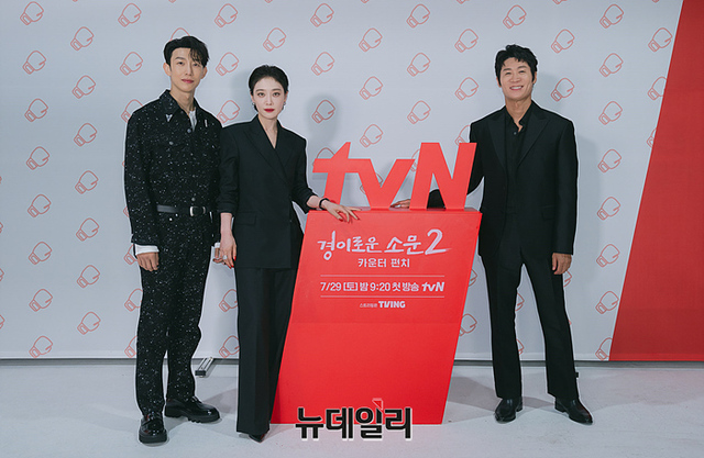 배우 강기영, 김희어라, 진선규가 21일 오후 온라인으로 열린 tvN 새 토일드라마 '경이로운 소문2(연출 유선동)' 제작발표회에서 포즈를 취하고 있다.