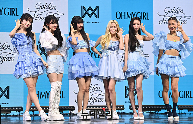 오마이걸 아린(왼쪽부터) 승희 유빈 효정 유아 미미가 24일 오후 서울 광진구 예스24 라이브홀에서 열린 미니9집 미디어 쇼케이스에서 포토타임을 갖고 있다.