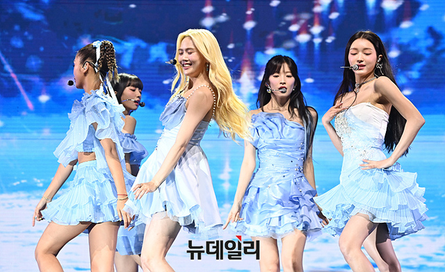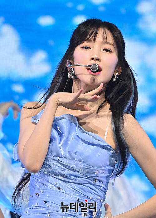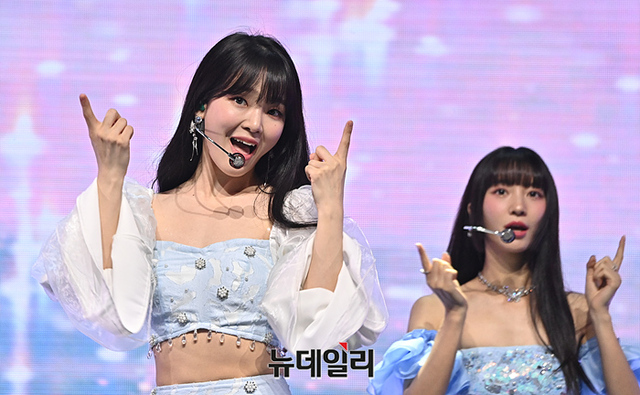 오마이걸이 24일 오후 서울 광진구 예스24 라이브홀에서 열린 미니9집 미디어 쇼케이스에서 타이틀곡 '여름이 들려' 무대를 선보이고 있다.