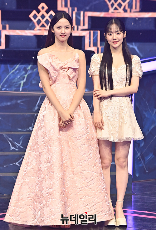 걸그룹 트리플에스 지우와 서연이 25일 오후 경기 고양시 일산 CJ ENM 스튜디오에서 진행된 Mnet 퀸덤퍼즐 생방송 전 포토타임에서 포즈를 취하고 있다.