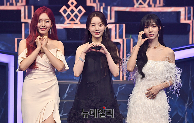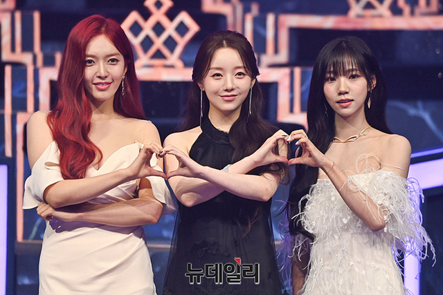 가수 도화, 케이, 여름이 25일 오후 경기 고양시 일산 CJ ENM 스튜디오에서 진행된 Mnet 퀸덤퍼즐 생방송 전 포토타임에서 포즈를 취하고 있다.