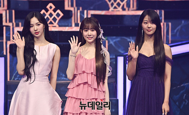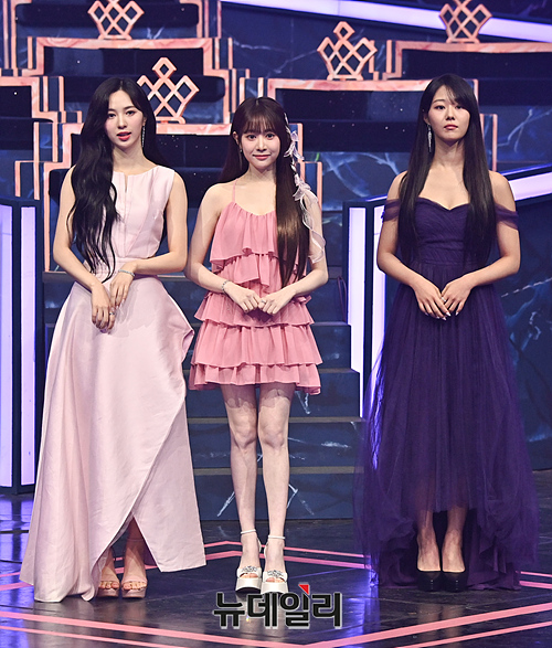 걸그룹 체리블렛 지원, 보라, 채린이 25일 오후 경기 고양시 일산 CJ ENM 스튜디오에서 진행된 Mnet 퀸덤퍼즐 생방송 전 포토타임에서 포즈를 취하고 있다.