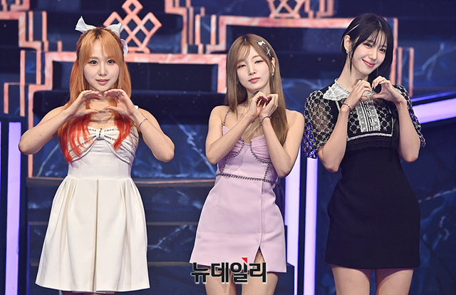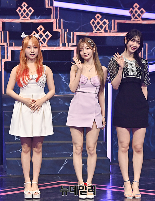 걸그룹 로켓펀치 쥬리, 연희, 수윤이 25일 오후 경기 고양시 일산 CJ ENM 스튜디오에서 진행된 Mnet 퀸덤퍼즐 생방송 전 포토타임에서 포즈를 취하고 있다.