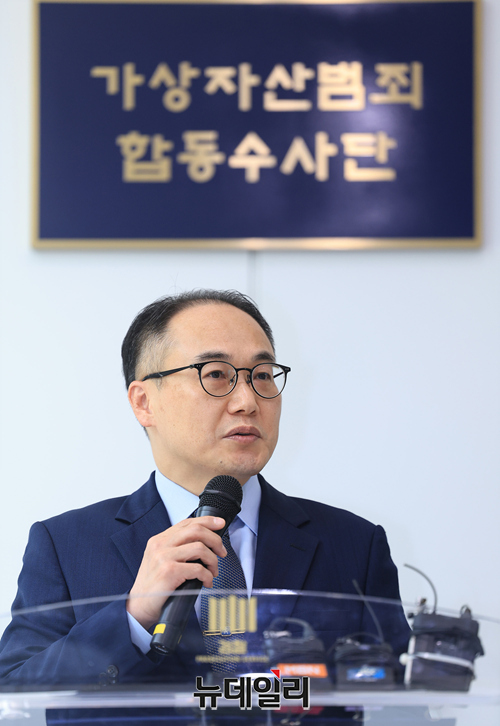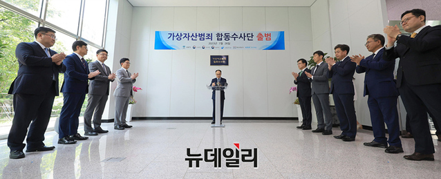이원석 검찰총장이 26일 오후 서울 양천구 서울남부지검에서 열린 가상자산범죄 합동수사단 출범식에서 인사말을 하고 있다. 초대 합수단장은 이정렬 서울중앙지검 공판3부장(사법연수원 33기)이 임명됐다.