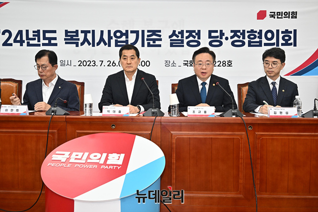 조규홍 보건복지부 장관이 26일 국회에서 열린 '24년도 복지사업기준 설정 당·정협의회'에서 발언하고 있다.
