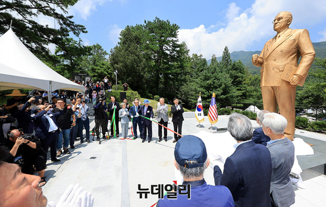 김박 앨트웰텍 회장, 신범철 국방부 차관 등 내빈들이 27일 오전 경북 칠곡군 다부동전적기념관에서 열린 이승만·트루먼 대통령 동상 제막식에서 트루먼 대통령 동상을 제막하고 있다.이날 제막한 동상은 김박 앨트웰텍 회장의 발의로 '이승만 트루먼 박정희 동상건립추진모임(동건추)'이 김영원 조각가에게 의뢰해 높이 4.2m로 제작했다. 한미동맹 70주년을 맞아 '한국전의 워털루'로 불리는 다부동 결전장에서 제막식을 갖게 됐다. (경북 칠곡=정상윤 기자)