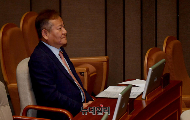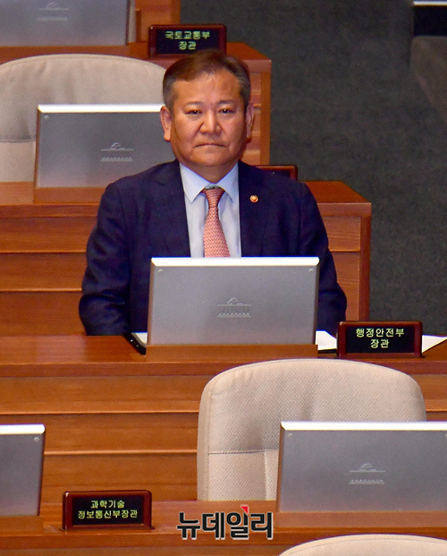 이상민 행정안전부 장관이 27일 오전 국회에서 열린 본회의에서 참석해 법안 통과를 지켜보고 있다.