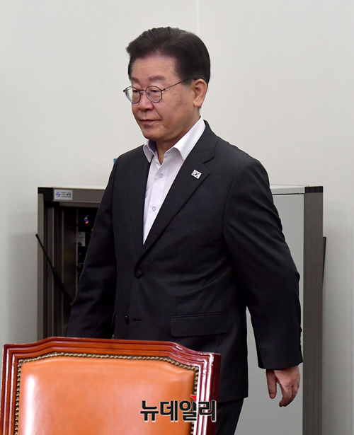 이재명 더불어민주당 대표가 28일 국회에서 열린 최고위원회의에 참석하기 위해 입장하고 있다.