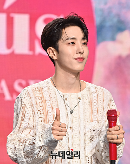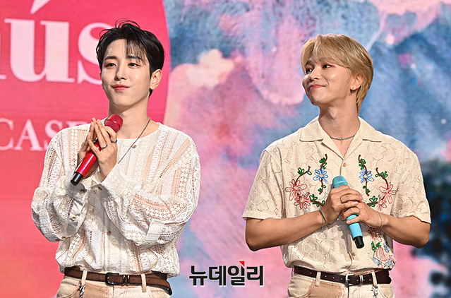 듀오 세븐어스(SEVENUS) 희재와 이레가 31일 오전 서울 강남구 일지아트홀에서 열린 데뷔 쇼케이스에서 데뷔 소감을 발표하고 있다.세븐어스는 보이그룹 서바이벌 경연 프로그램 피크타임에서 '팀 7시'로 준우승한 것을 계기로 새롭게 결성한 듀오다.첫 번째 싱글앨범 '썸어스(Summús)'는 타이틀곡 '원더랜드(Wonder Land)'를 포함해 '썸머 라이드(Summer Ride)' '인 어 드림(In a Dream)'까지 총 세 곡을 담았다. 음원은 낮12시 공개.