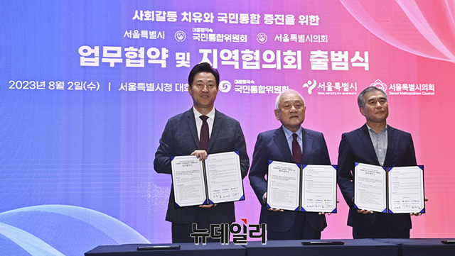 이날 행사에는 오세훈 서울특별시장과 김현기 서울특별시의회 의장이 행사에 참석해 김한길 국민통합위원장과 함께 업무협약을 체결했다.