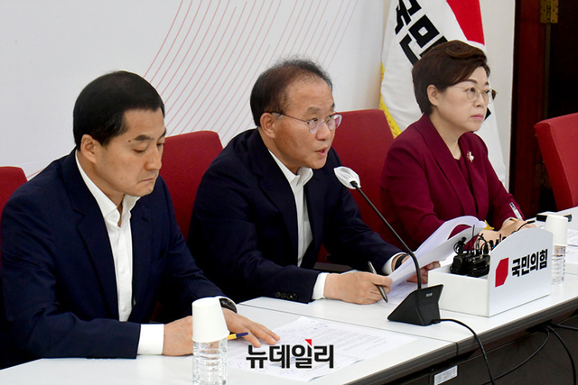 윤재옥 국민의힘 원내대표가 2일 오전 국회에서 무량판 공법 부실시공 관련 기자간담회를 갖고 있다.
