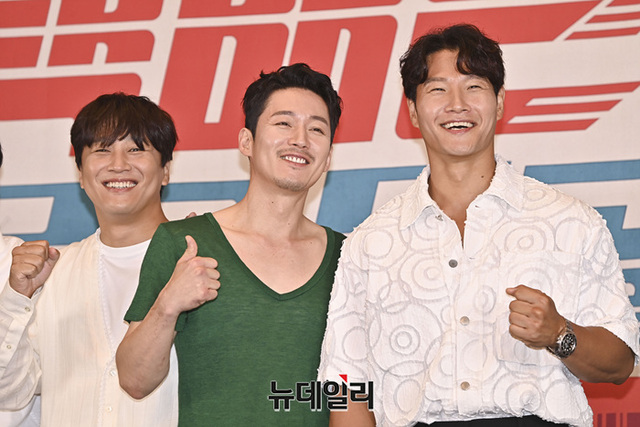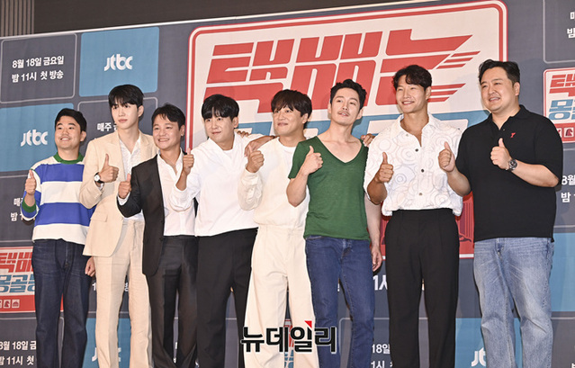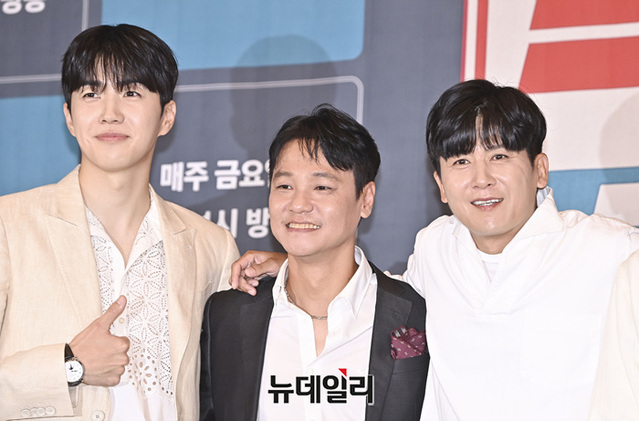 방송인 김종국, 장혁, 차태현, 홍경민, 홍경인, 강훈이 2일 오후 서울 서초구 더 리버사이드 호텔에서 열린 JTBC 신규 예능 '택배는 몽골몽골' 제작발표회에서 포토타임을 갖고 있다.