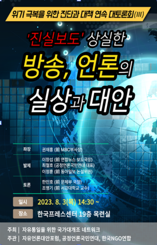전직 고위 언론인과 언론 학자, 전직 문화체육관광부 미디어 정책 담당자가 문재인 정권이 자행한 언론자유 말살 공작의 실체를 폭로하고, 대안을 제시하는 토론회를 연다.'자유통일을 위한 국가 대개조 네트워크' 주최, 자유언론대안포럼, 공정언론국민연대, 한국NGO연합 공동주관으로 3일 오후 2시30분 한국프레스센터 19층 목련실에서는 <'진실보도'를 상실한 공영언론의 실상과 대안> 토론회가 열린다.토론회 참석자들은 "가짜뉴스 공장으로 전락한 KBS, MBC, 연합뉴스 등 공영언론을 정상화하지 않으면 대한민국의 선진국 도약은 불가능하다"고 역설한다.이날 토론회는 좌장인 권재홍 전 MBC 부사장이 사회를 본다. 해직언론인인 이창섭 전 연합뉴스 편집국장이 '문재인 정권의 언론인 숙청 실상', 최철호 공정언론국민연대(공언련) 대표(전 KBS PD)가 '미디어를 장악한 민노총과 민주당발 방송위기와 대안', 이정훈 전 동아일보 논설위원이 '언론사, 언론인, 정치가 만든 언론위기 실상과 대안'을 주제로 각각 발제를 한다.또 조맹기 서강대 신문방송학과 명예교수, 문화체육관광부 미디어정책관 출신인 한민호 '공자학원 실체 알리기 운동본부 대표'가 토론자로 참여해 열띤 토론을 벌일 예정이다.권 전 부사장은 모두 발언을 통해 "문재인 정권은 적폐청산을 이유로 문명국가에서는 상상조차 할 수 없는 언론인 숙청, 언론자유 탄압을 자행했다"면서 "언론자유 말살 공작의 진상을 규명하는 것에서 윤석열 정부의 언론, 문화정책 핵심 과제가 되어야 한다"고 말한다.박근혜 정부 때 편집국장을 지냈으며 보수적 성향을 가졌다는 이유로 연합뉴스에서 해고된 이창섭 전 편집국장은 "문재인 정권 들어 KBS, MBC, 연합뉴스 YTN 등 공영언론사에 민노총 언론노조 주도로 보수 성향 언론인에 대한 대대적인 숙청이 이뤄졌다"며 "외부 정치세력과 연결된 민노총 언론노조 기자들이 완장을 차고 동료 기자를 고발하고 조사하고 숙청했다"고 주장한다.이 전 국장은 "KBS에는 진실과미래위원회, MBC에는 정상화위원회, 연합뉴스에는 혁신위원회, YTN에는 미래발전위원회라는 등 인민위원회를 방불케 하는 호위병 조직이 구성돼 동료들에 대한 사상검증을 실시했다"며 "이로 인해 한국 언론의 언론자유 지수가 수십년 후퇴했다"고 지적한다.그는 "언론인 숙청의 결과로 남은 것은 균형 보도, 사실 보도, 진실 보도의 상실"이었다면서 "문재인 정권의 언론자유 말살 정책이 어떻게 입안되고 실행됐는지 진상을 밝히고 관련자들을 모두 처벌해야 한다"고 주장한다.공정언론 구현을 목표로 활동 중인 공언련 최철호 대표는 "미디어를 장악한 민노총 언론노조와 민주당의 교묘한 협업으로 후쿠시마 괴담, 윤석열 대통령 뉴욕 발언 조작 보도 등 편파, 왜곡 보도가 기승을 부리고 있다"며 "사실 왜곡과 여론 조작의 통로를 차단해야 국민이 합리적 판단을 할 수 있다"고 설명한다.이어 "KBS, MBC, 연합뉴스 등에서 편파적으로 다룬 이슈를 한겨레, 경향, 오마이뉴스 등이 다루고 방송사의 시사 기획프로그램이 증폭하면 네이버와 다음에서 집중 노출되고 편향적 댓글이 붙고 이 과정에서 민주당의 성명과 사이비 시민단체의 호응이 이뤄진다"면서 "광우병 사태와 동일한 구조의 선전선동 메커니즘이 존재한다"고 지적한다.최 대표는 지나치게 많은 공영언론사의 민영화와 방송통신위원회, 방송통신심의위원회 등 규제 기관의 정상화, 기득권 집단이 된 민노총 언론노조의 횡포 저지, 합리적 언론노동운동 활성화 등을 대안으로 제시한다.이정훈 전 동아일보 논설위원은 "1988년 민주화 이후 입사한 세력이 노조를 만들어 공영언론을 장악했다"면서 "객관성을 버리고 내가 선택한 것이 기사라는 오만에 빠진 이들이 한국 언론을 망치고 있다"고 비판한다.조맹기 서강대 명예교수는 "언론은 정확성, 공정성, 합리성, 독립성을 확보함으로써 신뢰를 확보하고 언론자유라는 권리를 행사할 수 있게 되는데 문재인 정권은 이런 시스템을 붕괴시켜 완장 찬 언론노조 간부를 권력자라는 신분집단으로 만들었다"며 "특권층이 된 기득권 집단을 해체하지 않으면 선진국 진입이 불가능해 진다"고 언론개혁의 당위성을 역설한다.문체부 미디어정책관을 지낸 한민호 공자학원 실체 알리기 운동본부 대표는 "보수 진영이 좌파의 정체, 실력에 대해 무지했기 때문에 언론, 역사, 문화, 교육 전쟁에서 참담한 패배를 당했다"면서 "특히 언론계는 좌경 세력이 평기자부터 부장, 국장, 사장까지 총체적으로 장악하고 있다"고 지적한다.한 대표는 "윤석열 정부가 성공하기 위해서는 단기적으로는 언론계를 정상화해서 객관보도, 사실보도, 진실을 추구하는 논평이 이뤄지도록 해야 하며 장기적으로는 역사, 문화전쟁 전담조직을 정비하고 적재적소에 우수한 인재를 배치해서 전체주의, 포퓰리즘으로 국가가 퇴보하는 것을 막아야 한다"고 강조한다.