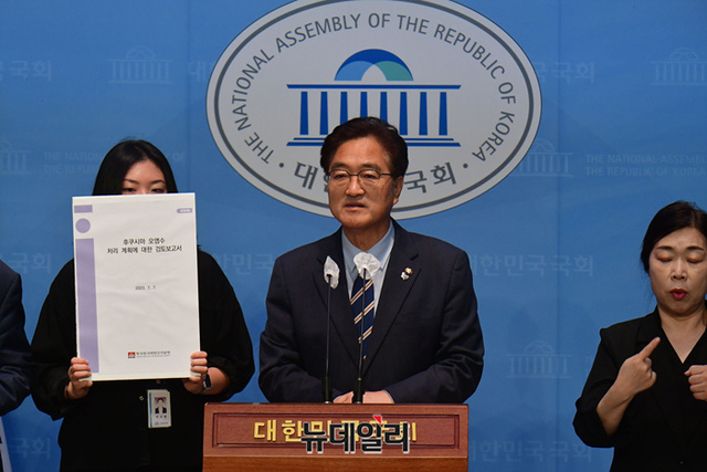 우원식 더불어민주당 후쿠시마원전오염수 해양투기저지 총괄대책위원회 상임위원장이 3일 오전 국회 소통관에서 후쿠시마 오염수 시찰단 보고서 비판 기자회견을 하고 있다.