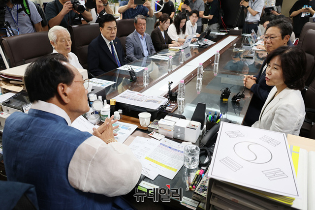 김호일 대한노인회장이 3일 서울 용산구 대한노인회 중앙회에서 노인 비하 발언 논란으로 사과 방문한 김은경 더불어민주당 혁신위원장에게 사과를 받고 면담을 하고 있다.