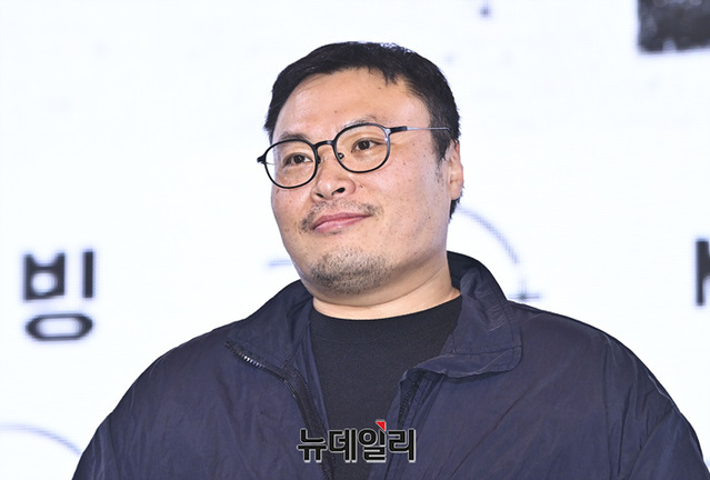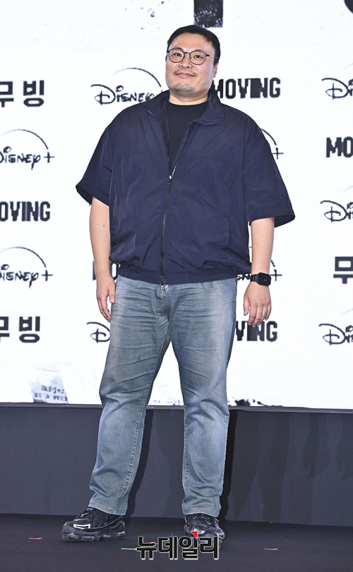 만화가 강풀이 3일 오후 서울 강남구 그랜드 인터컨티넨탈 서울 파르나스에서 열린 디즈니+ 드라마 '무빙' 제작발표회에서 포토타임을 갖고 있다.
