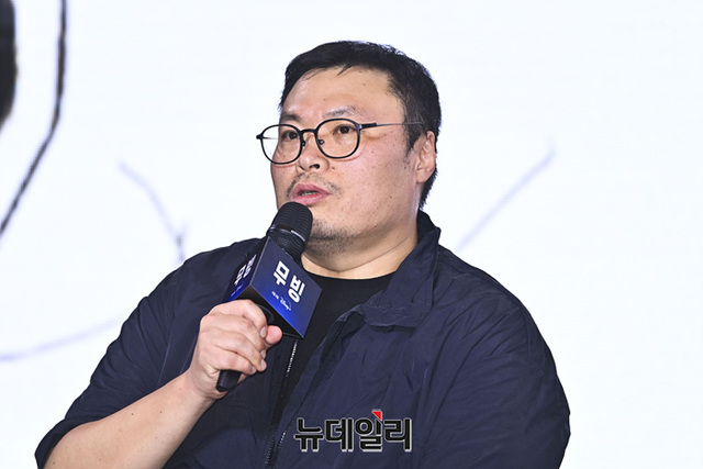 박인제 감독, 배우 김희원, 김성균, 차태현, 류승룡, 한효주, 조인성, 이정하, 고윤정, 김도훈, 강풀 작가가 3일 오후 서울 강남구 그랜드 인터컨티넨탈 서울 파르나스에서 열린 디즈니+ 드라마 '무빙' 제작발표회에서 소감을 밝히고 있다.