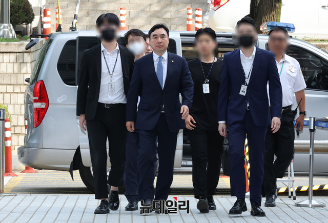 더불어민주당 전당대회 돈봉투 살포 의혹을 받고 있는 무소속 윤관석 의원이 4일 오전 서울 서초구 서울중앙지방법원에서 열린 영장실질심사에 출석하고 있다.
