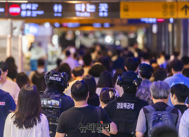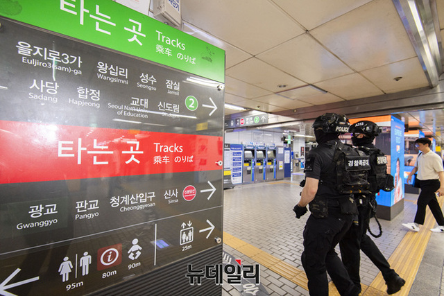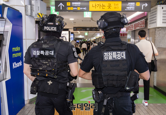 신림역 칼부림 사건에 이어 분당 서현역 흉기난동으로 국민 불안감이 커지고 온라인 커뮤니티와 SNS에 살인 예고글을 올린 46명을 검거한 가운데 경찰특공대가 7일 오전 살인 예고 지역인 강남역에서 순찰을 돌고 있다.